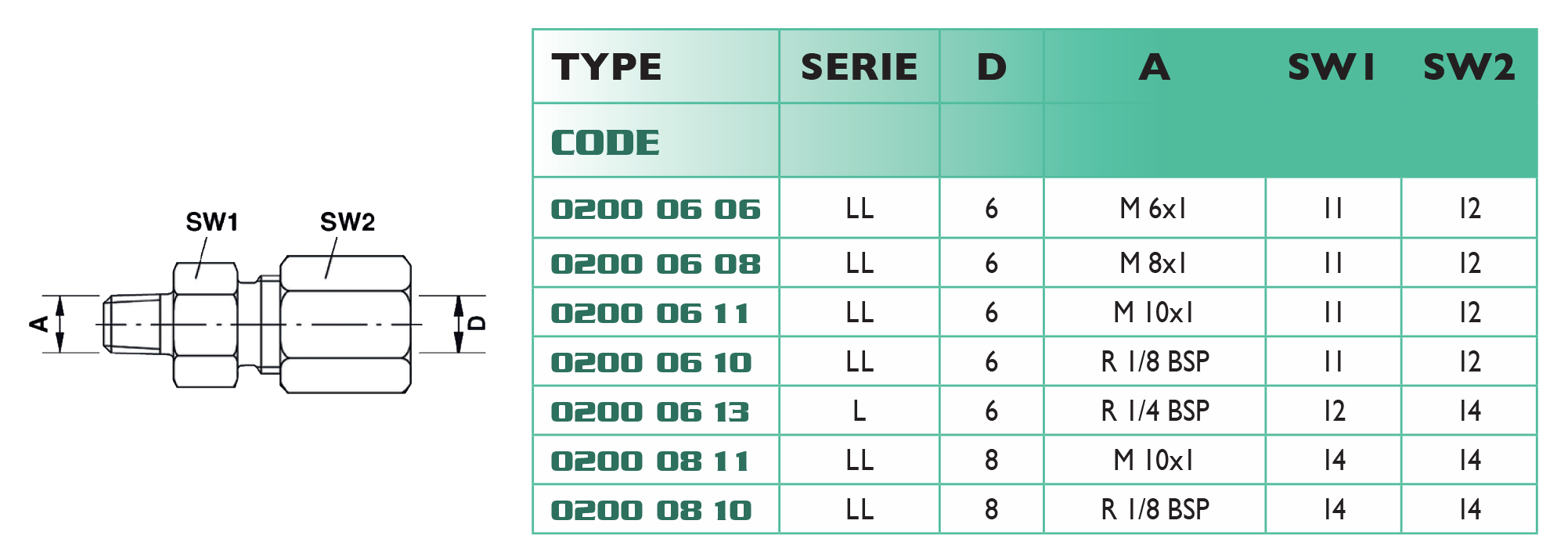 Technical features - construction in zinc-plated steel - setas of fittings, ogive-seals and screw-nuts are manufactured in compliance with DIN 2353. - hose : indication of the external diameter - threads : taper BSP and metric - maximum working pressure : see board on attached technical datasheet - working temperature : -40°C ÷ 100°C (depends on the features of the selected pipes)
