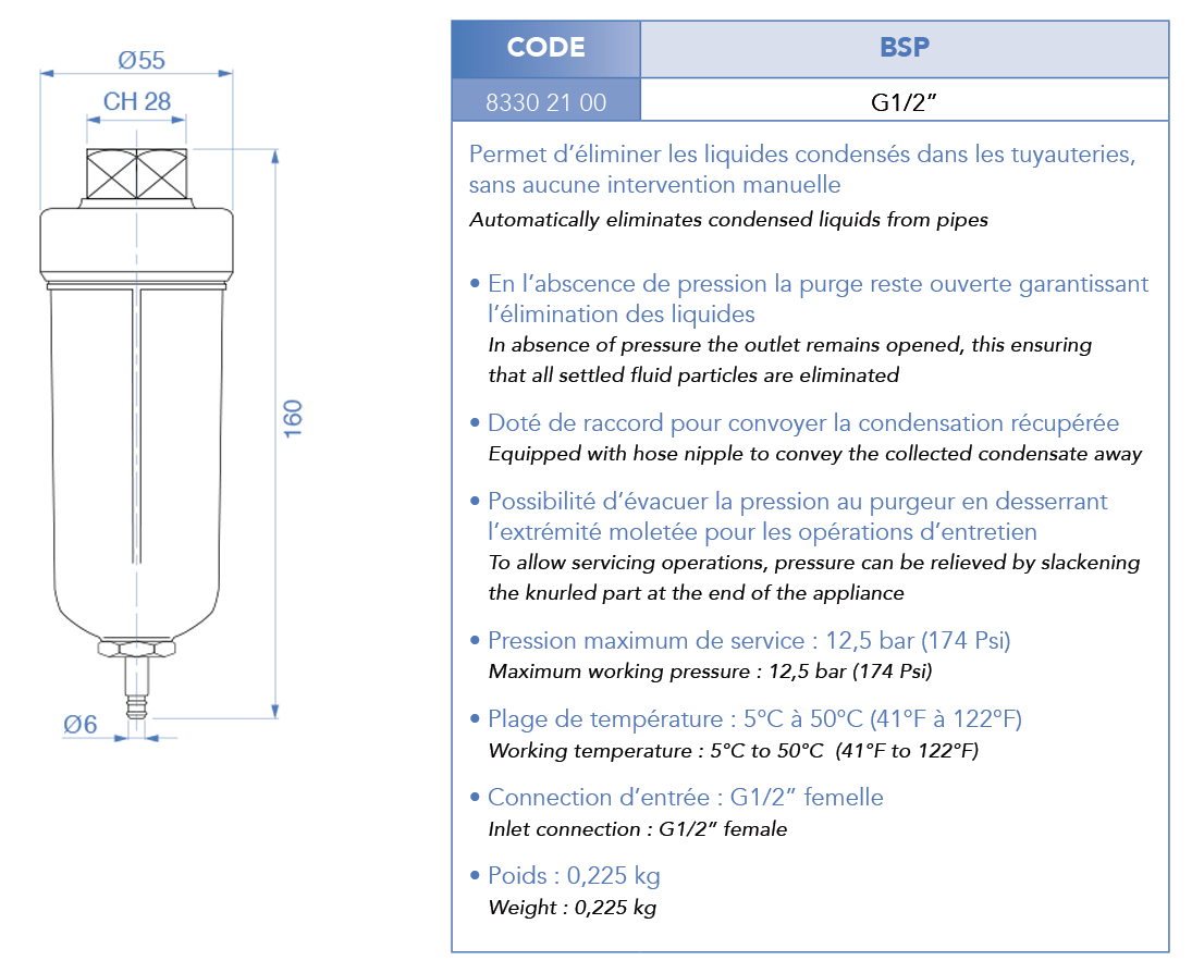 With a maximum service pressure of 12.5 bar and a temperature range from 5°C to 50°C, these purgers are suitable for a wide range of industrial applications. Their G1/2" female input connection allows for easy integration into existing systems, while their lightweight of 0.225 kg facilitates installation and handling.