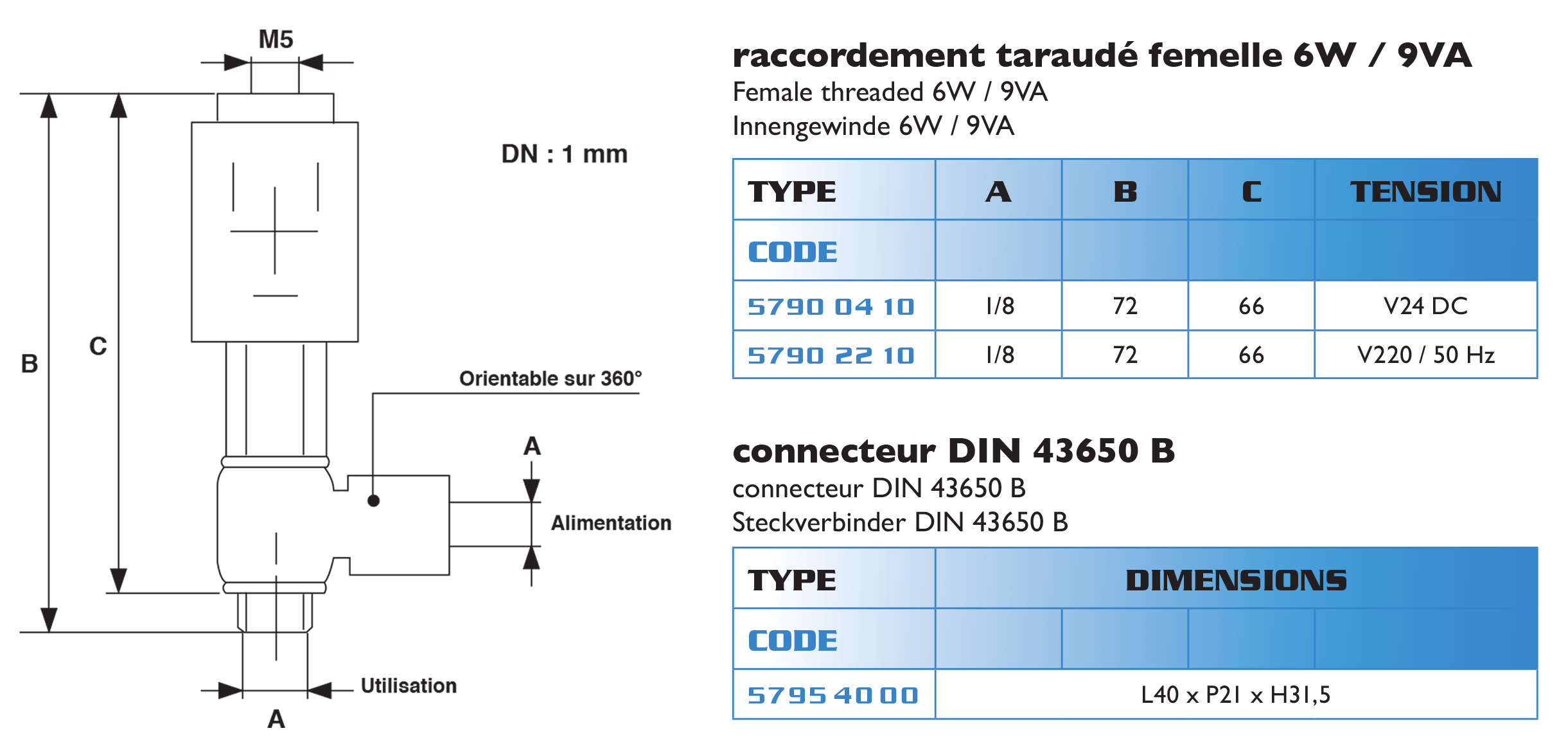 ELECTRO-PILOTE 3/2 NF raccordement taraudé femelle 6W / 9VA et connecteur DIN 43650 B