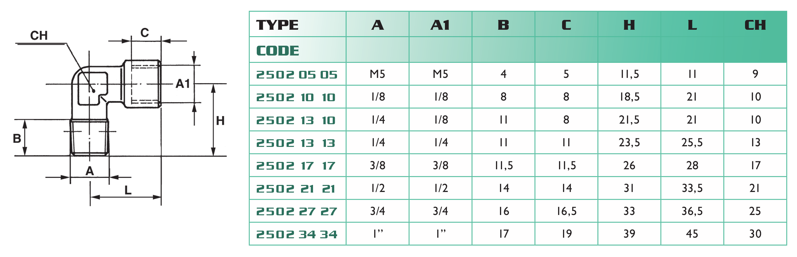 - filetages : mâle conique BSP, mâle cylindrique BSP et femelle cylindrique BSP